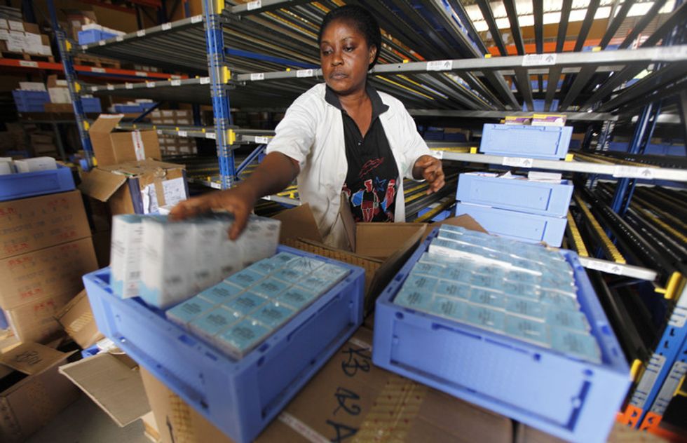 A worker handles medicine in the Pharmacie de la Sante Publique warehouse in Abidjan, Ivory Coast. Opioid painkillers can be difficult to access in many parts of Africa.