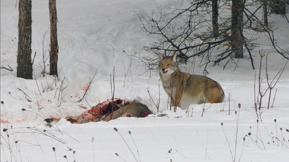 Eastern coyotes hunt a wide range of animals, including small rodents but also deer. Two eastern coyotes took down this deer in eastern Canada, according to the photographer.