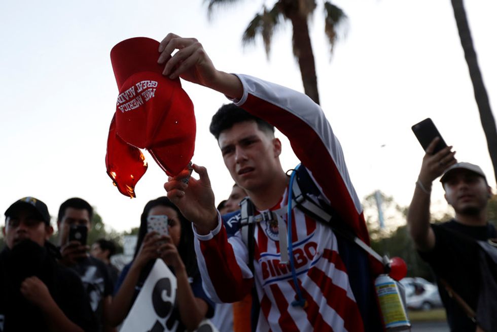 A demonstrator burns a hat in protest of Donald Trump outside a campaign rally in San Jose, California, June 2, 2016.