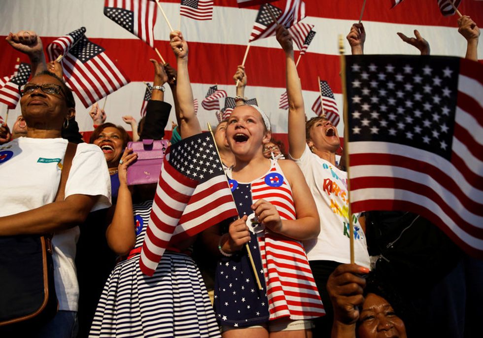 Young and old supporters of Clinton cheer, June 7, 2016.