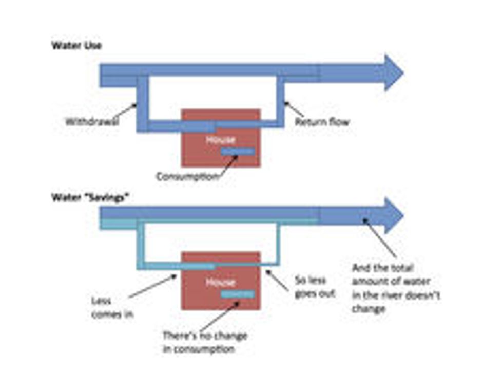 With most water “saving” technologies, less water is taken out of a river, but that also means that less water is put back into the river. It makes a difference to your water bill – you had to pump less water! However, your neighbor in the town downstream doesn’t care if that water ran through your tap before it got to her. She cares only about how much total water there is in the stream. If you took out less but also put back less so the total didn’t change, it doesn’t make a difference to her.