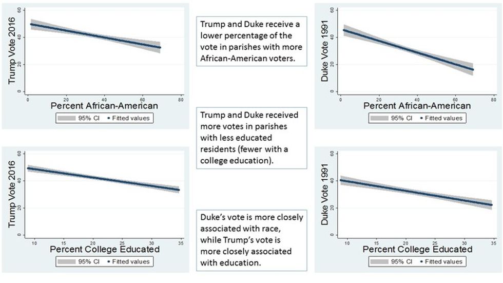 Using statistical models based on these data, we found that relative to David Duke’s vote, Trump’s vote is more closely associated with education, meaning he pulls more strongly from less educated voters. Duke’s vote is more closely associated with race. But, if there are differences in their bases of support, the similarities are even more striking, especially given that a quarter of a century has passed since Duke’s 1991 campaign.