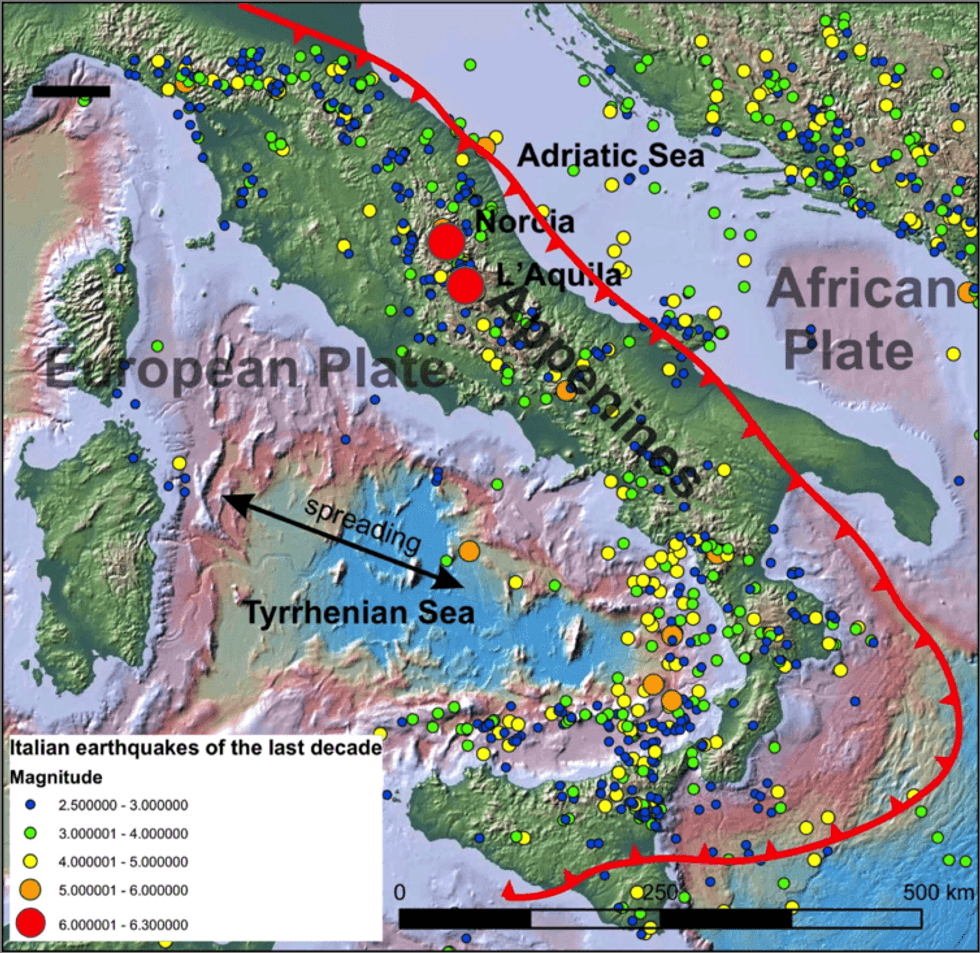 This earthquake is no surprise. Italy is prone to earthquakes; it sits above the boundary of the African and European plates. The oceanic crust of the African plate is subducting (sinking) under Italy, creating iconic natural features such as the volcano at Mount Vesuvius. These plates are converging at a rate of around 5mm each year.