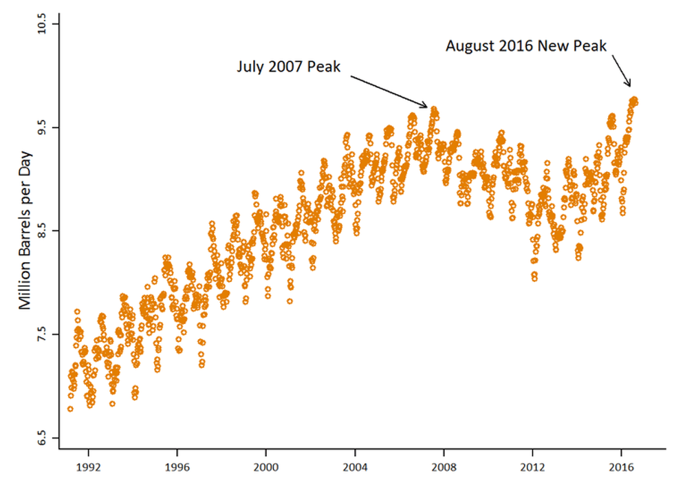 Moreover, since gasoline prices plummeted in the last few months of 2014, Americans have been buying gasoline like crazy. Last year was the biggest year ever for U.S. vehicle sales, with trucks and SUVs leading the charge. This summer Americans took to the roads in record numbers. The U.S. average retail price for gasoline was $2.24 per gallon on August 29, 2016, the lowest Labor Day price in 12 years. No wonder Americans are driving more.