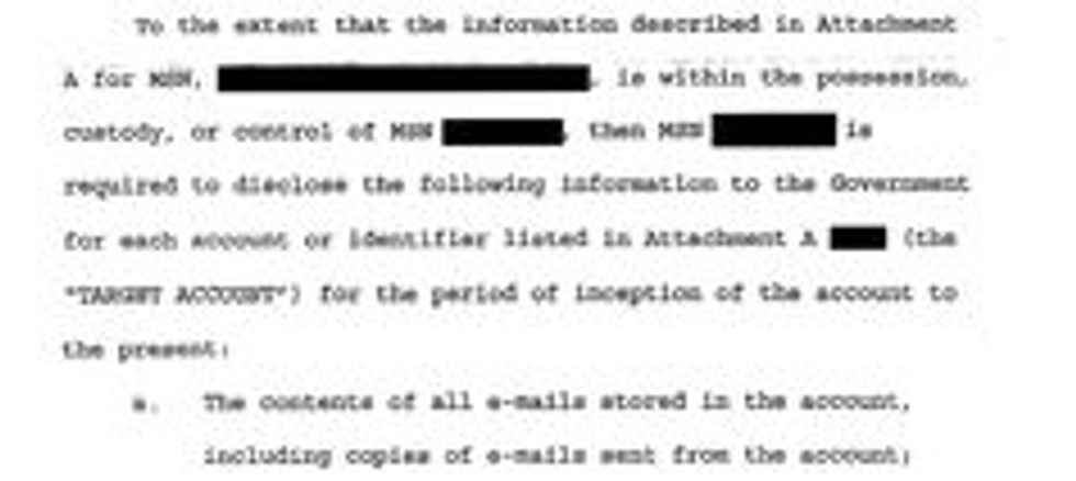 It’s very difficult to get a copy of one of these search warrants, thanks to orders sealing files and gagging companies. But in another Microsoft lawsuit against the government a redacted warrant was made part of the court record. It shows how the government asks for – and receives – the power to look at all of a person’s email.