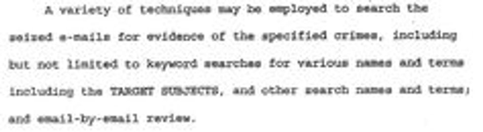 In warrants like this, the government is deliberately not limiting itself to the constitutionally required “particular description” of the messages it’s looking for. To get away with this, it tells judges that incriminating emails can be hard to find – maybe even hidden with misleading names, dates and file attachments – so their computer forensic experts need access to the whole data base to work their magic.