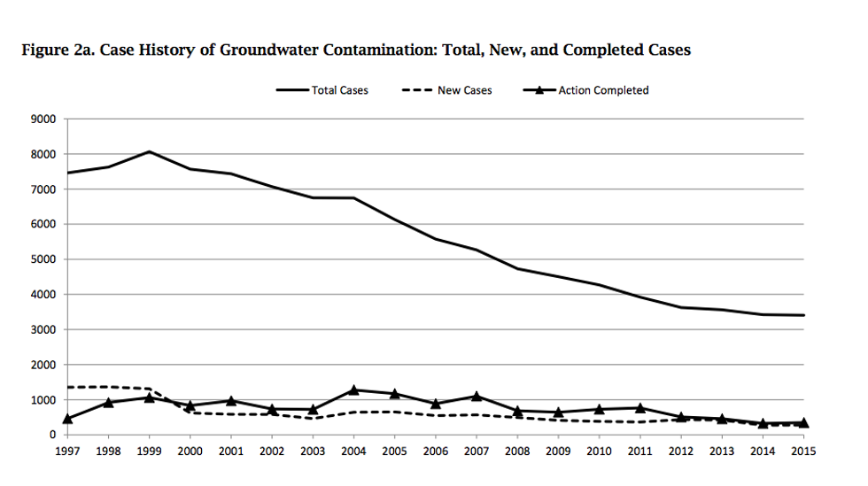 - State regulators in 2015 were dealing with more than 3,400 total groundwater contamination cases in some capacity — mostly those first documented years ago. This number has plunged each year since 2000.