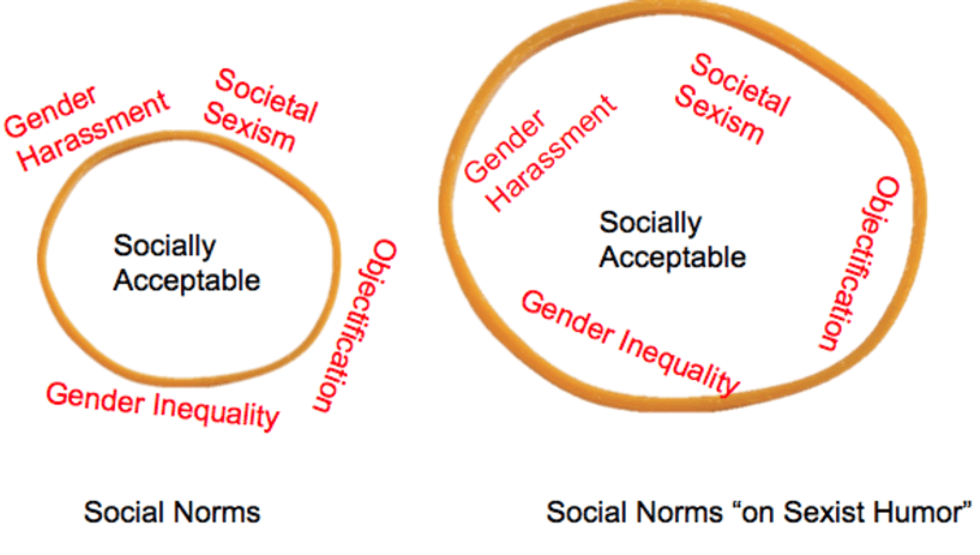 Sexist humor essentially stretched the rubber band; it expanded the bounds of acceptable behavior to include responses that would otherwise be considered wrong or inappropriate. So, in this context of expanded acceptability, sexist men felt free to express their antagonism without the risk of violating social norms and facing disapproval from others. Sexist humor signaled that it’s safe to express sexist attitudes.