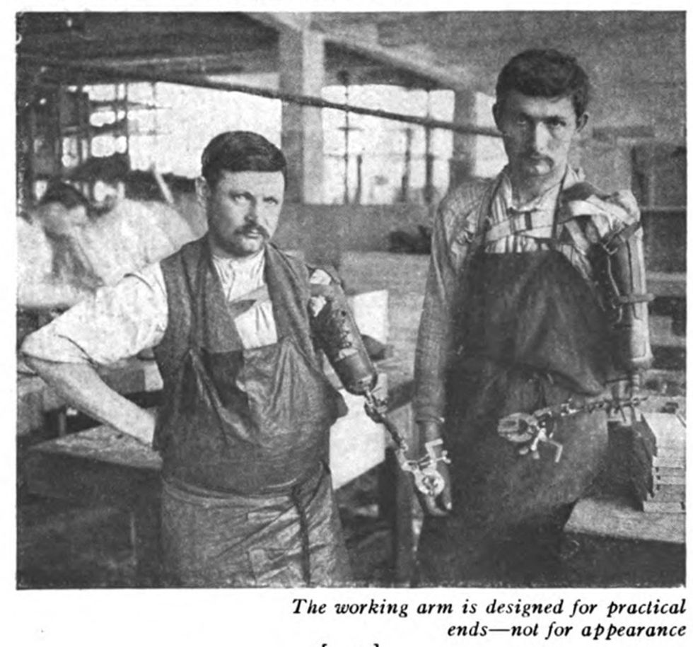 But Amar also recognised that aesthetics were sometimes important. A salesman, for instance, was expected to have a good appearance. He should have both hands, even if he could not grab anything with them. For this reason, the “scientific prosthesis” Amar developed came with different attachments, depending on the task to be completed. It was, however, supplied with a wooden hand that could be attached to the socket depending on the social setting: the wooden hand was unnecessary in the factories, where the aesthetic function of the human body was irrelevant and other tools were more practical.