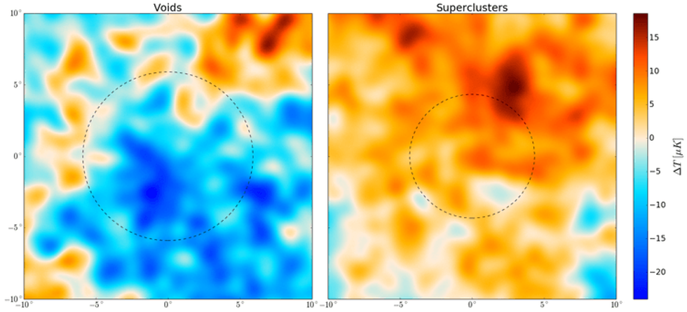 However, in 2008 a team of astronomers from the University of Hawaii attempted to measure this effect. To do so, they first identified 50 individual voids and superclusters each in the distribution of galaxies in the sky, and then measured the average temperature of each type of structure using Planck’s cosmic microwave background map. Sure enough, the radiation appeared colder when seen through voids than through superclusters. However, the apparent size of the effect was more than five times larger than predicted by calculations.