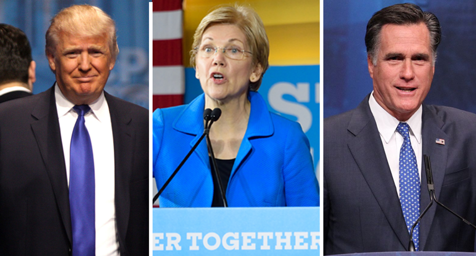 Sen. Elizabeth Warren ripped Donald Trump and former Republican presidential candidate Mitt Romney over reports the former rivals are meeting this weekend to discuss a potential cabinet position.