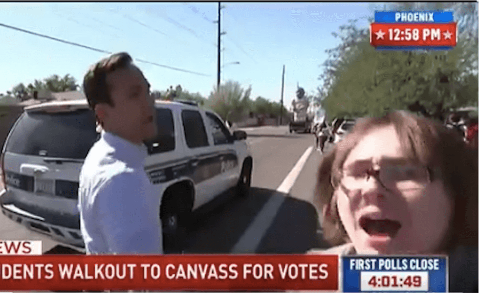 During a live shot outside a high school in in Phoenix, Arizona, a teenage protester disrupted the broadcast by edging into the camera frame and shouting, "Fuck Joe Arpaio!"