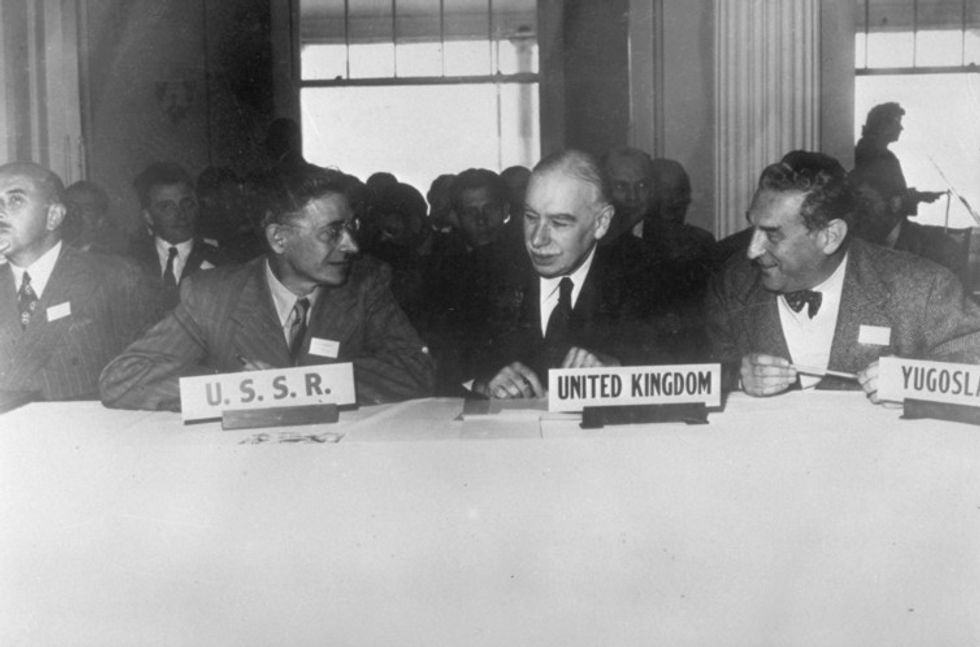 Monetary Conference at Bretton Woods, New Hampshire in July 1944, attended by representatives of 44 nations, including M.S. Stepanov of Russia, Lord John Maynard Keynes and Vladimir Rybar of Yugoslavia.