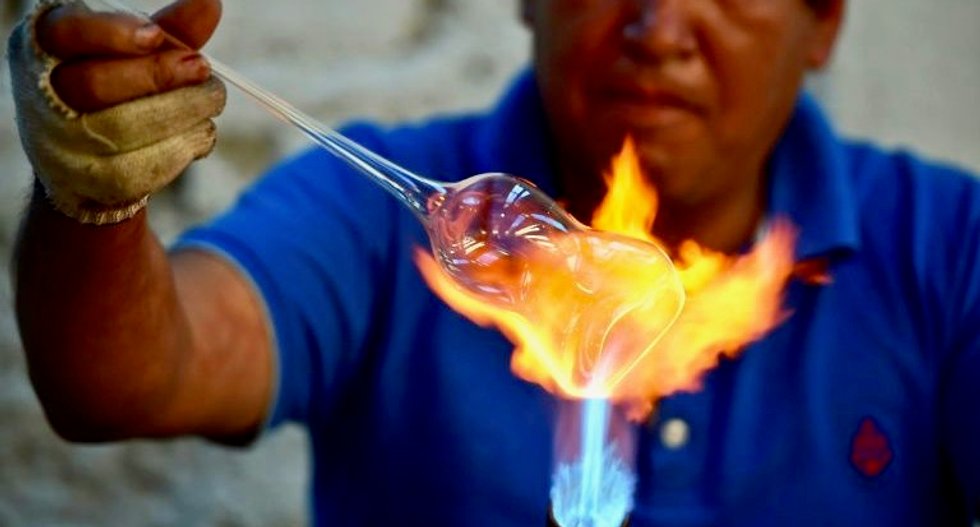 Sweat runs down Adan Marin's wrinkled face as he blows into a blob of molten glass, creating a perfect, delicate sphere within the blue and orange flames of his torch.