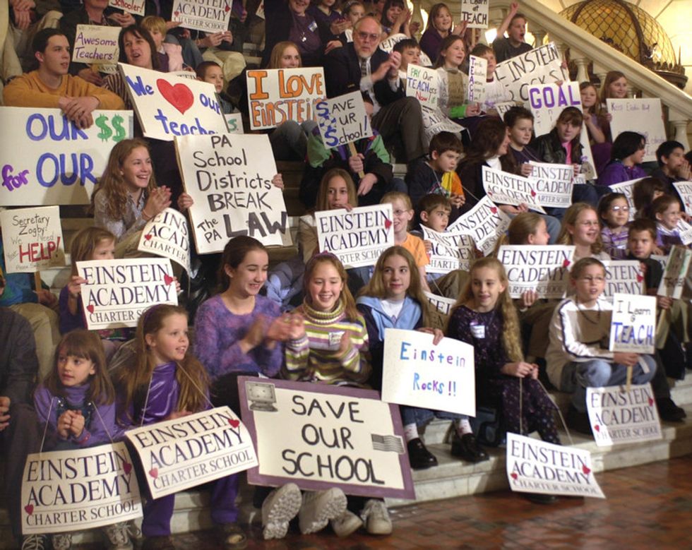Pupils from the Einstein Academy Charter School rally in the State Capitol rotunda in Harrisburg, Pennsylvania to protest state policies.