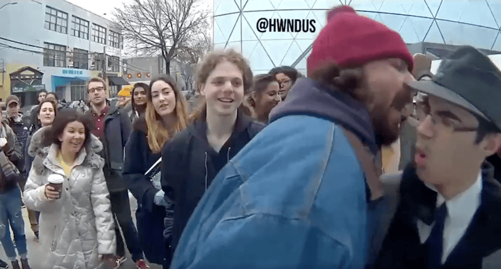 In the video, LaBeouf follows the man around and continues shouting "He will not divide us." At one point, the two are aggressively in each other's faces as LaBeouf continues yelling "He will not divide us" in the face of the other man, who eventually leaves the scene.