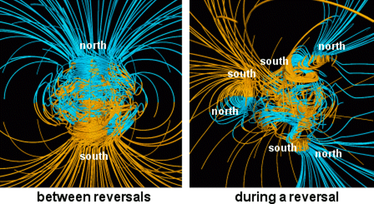 What currently has geophysicists like us abuzz is the realization that the strength of Earth’s magnetic field has been decreasing for the last 160 years at an alarming rate. This collapse is centered in a huge expanse of the Southern Hemisphere, extending from Zimbabwe to Chile, known as the South Atlantic Anomaly. The magnetic field strength is so weak there that it’s a hazard for satellites that orbit above the region – the field no longer protects them from radiation which interferes with satellite electronics.