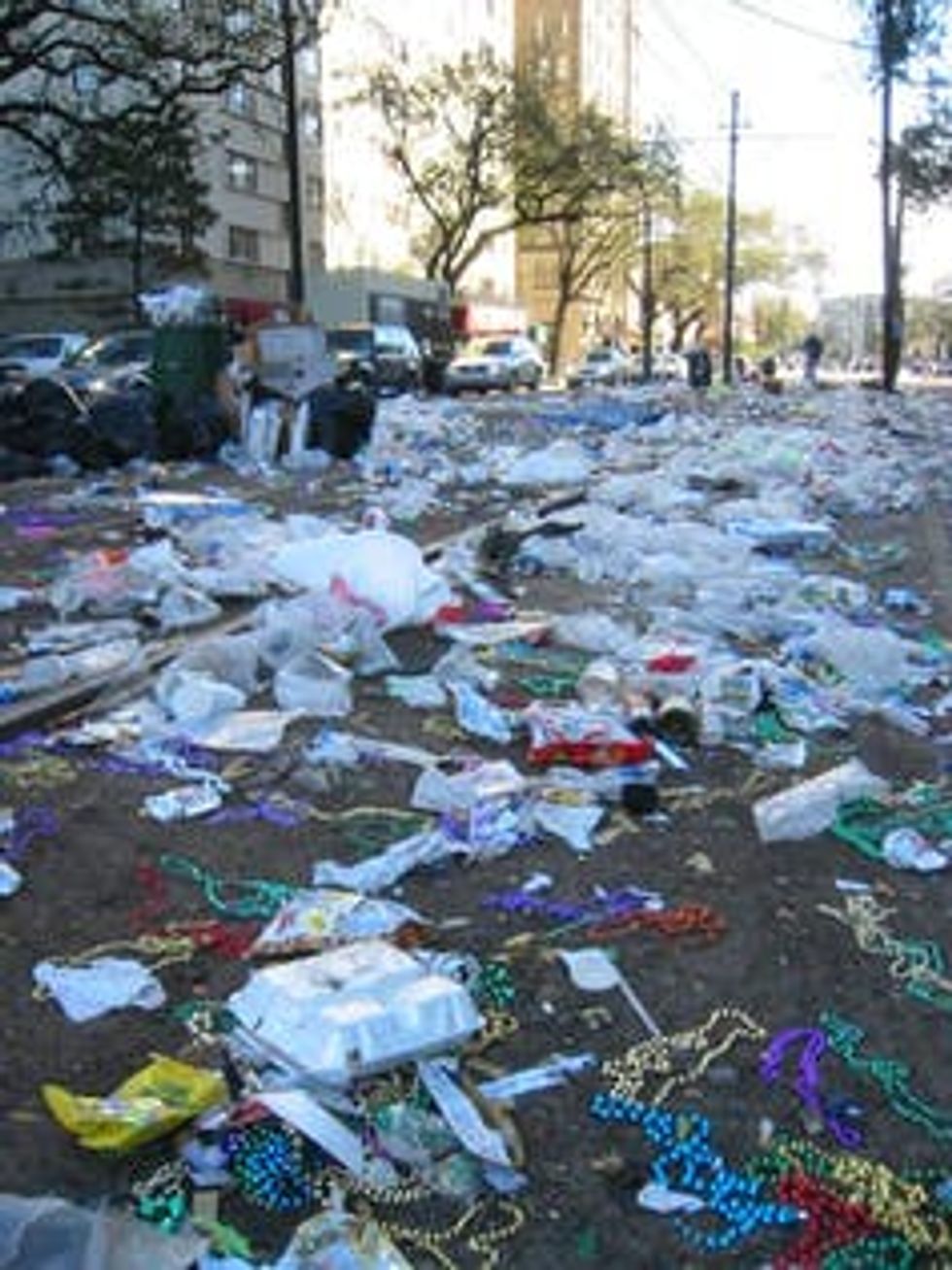 And then there are the beads that don’t get taken home. By the time Mardi Gras is over, thousands of shiny necklaces litter the streets, and partiers have collectively produced roughly 150 tons of waste – a concoction of puke, toxins and trash.