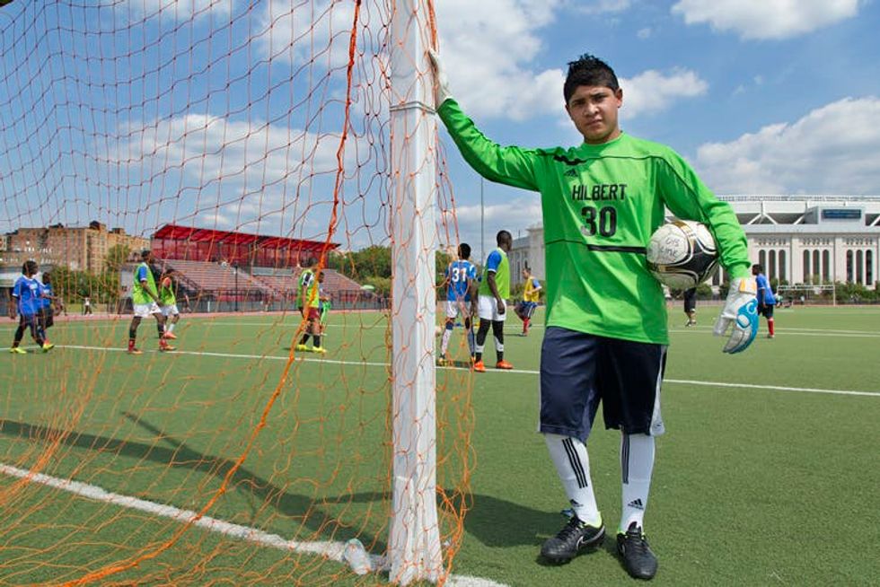 An unaccompanied minor from Honduras at a youth league soccer game in the Bronx, New York.