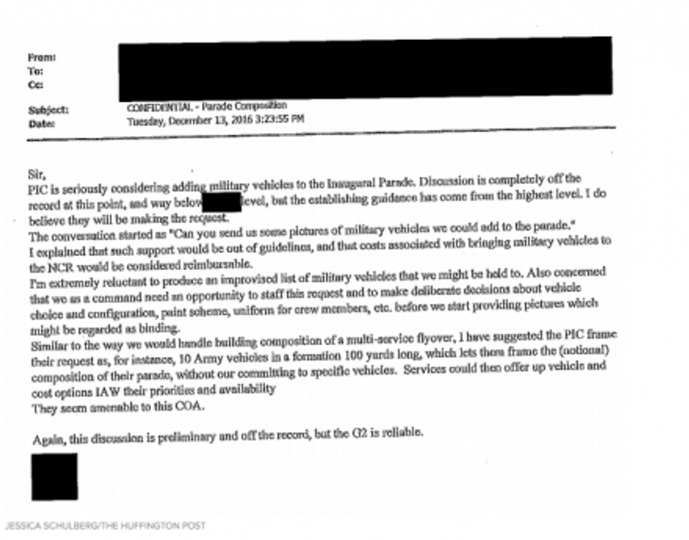 The Presidential Inaugural Committee “is seriously considering adding military vehicles to the Inaugural Parade,” a Pentagon official wrote in an internal email dated Dec. 13, 2016 acquired by the Huffington Post. “The conversation started as ‘Can you send us some pictures of military vehicles we could add to the parade,’” the official wrote.