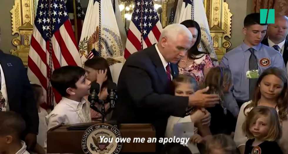 A video edited by HuffPost reveals that after getting the vice presidential elbow, the young boy followed Pence around saying "excuse me," and at one point politely said "you owe me an apology" to the vice president who was busy posing for photos with less irked children.