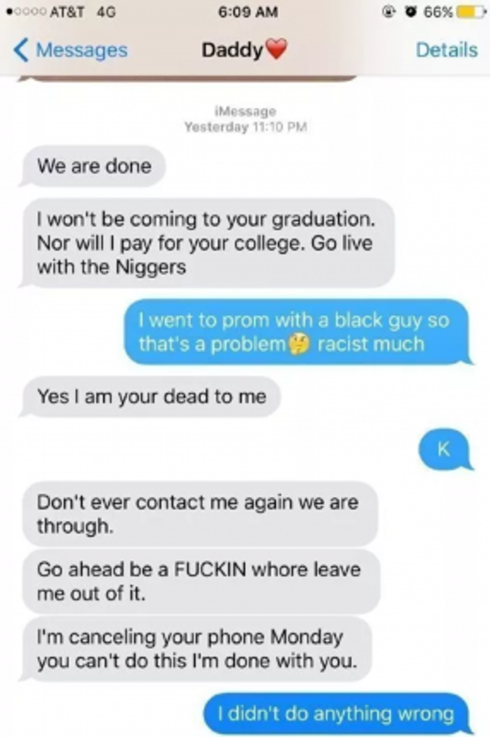"We are done," her father texted her according to the screen captures posted on Facebook. "I won't be coming to your graduation. Nor will I pay for your college. Go live with the N***er [sic]."