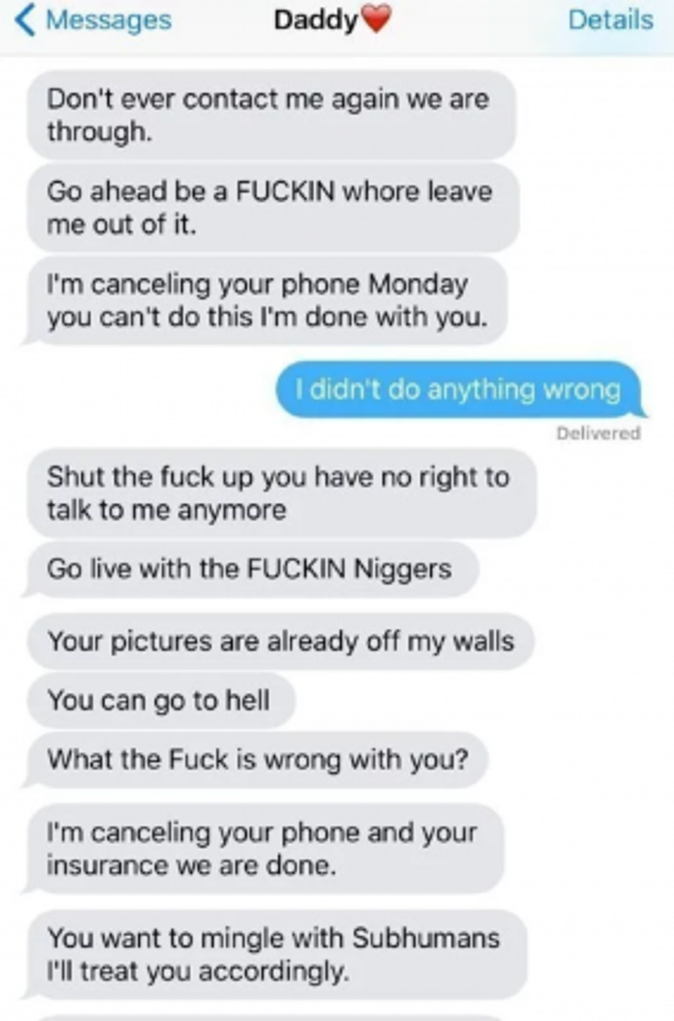"Shut the f*ck up you have no right to talk to me anymore," he continued. "Go live with the F*CKIN N***ers. Your pictures are already off my walls. You can go to hell. What the F*ck is wrong with you? I'm canceling your phone and your insurance we are done. You want to mingle with Subhumans I'll treat your accordingly."
