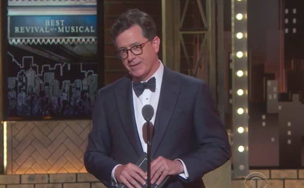In an appearance at the 2017 Tony Awards, CBS "Late Night" host Stephen Colbert presented the award for Best Musical Revival and took the opportunity to fire off a shot at President Donald Trump's inept, chaotic administration.