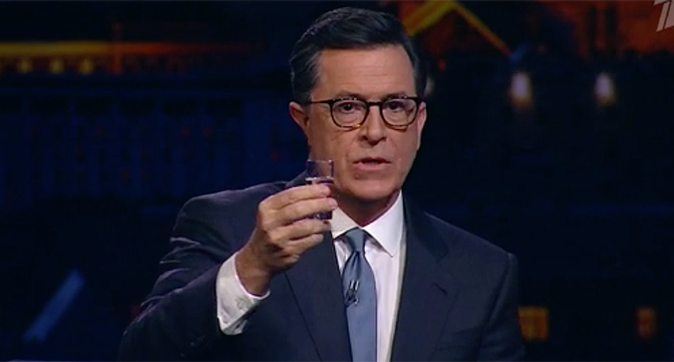 According to the Daily Beast, Colbert appeared on Evening Urgent, a late-night talk show in Russia. He joined Ivan Urgant for a game of "Russian roulette," but used vodka shots and pickles instead of weapons. Colbert made a toast with each drink.