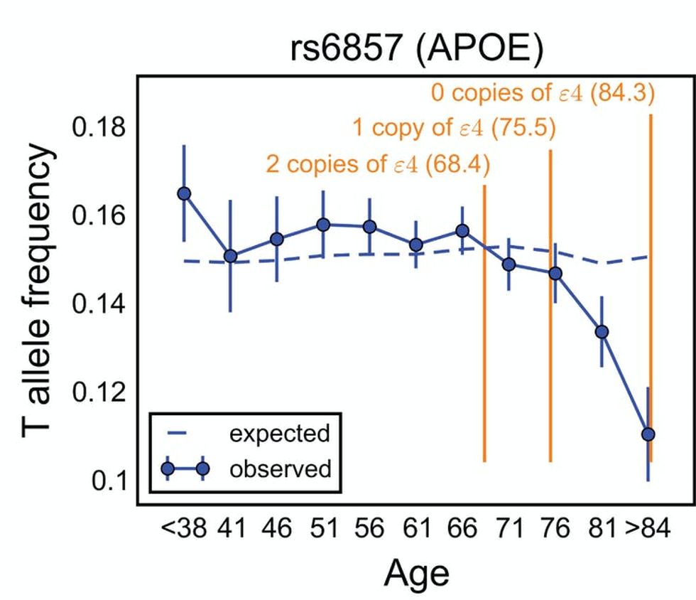 Across the genome, we found two variants that endanger survival. The first is a variant of the APOE gene, which is a well-known risk factor for Alzheimer’s disease. It drops in frequency beyond age 70. The second harmful variant we found is a mutation in the CHRNA3 gene. Associated with heavy smoking, this inherited mutation starts to decrease in frequency at middle age in men, because carriers of this mutation are less likely to survive longer.