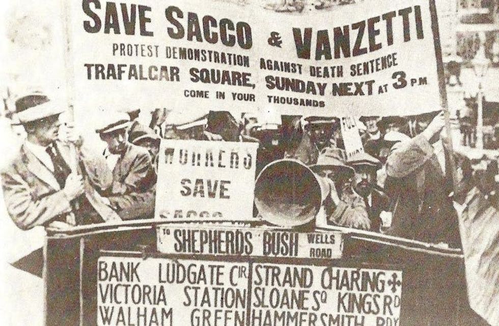 Demonstrators in London protest the conviction of Nicola Sacco and Bartolomeo Vanzetti, 1921.