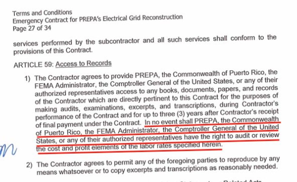 "In no event shall PREPA, the Commonwealth of Puerto Rico, the FEMA Administrator, the Comptroller General of the United States, or any of their authorized representatives have the right to audit or review the cost and profit elements of the labor rates specified herein," the contract reads.