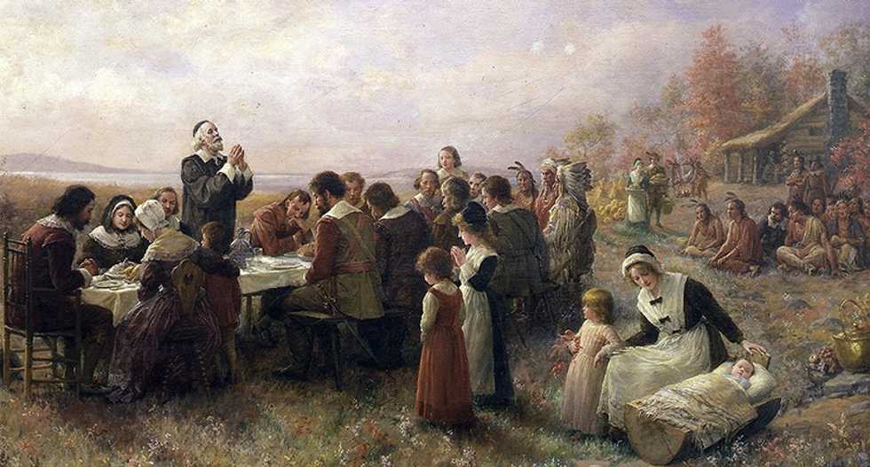 The only eyewitness account of the first Thanksgiving comes from a letter written by Edward Winslow on Dec. 11, 1621. In it, he describes how the Puritans, after utilizing fertilization methods imparted by Tisquantum (also known as “Squanto”), had their first successful harvest. To celebrate, Governor William Bradford “sent four men on fowling” and they returned later that day with enough food to feed the colony for almost a week. Since waterfowl was plentiful in the Massachusetts Bay area, it’s widely accepted that they were eating goose and duck rather than turkey.
