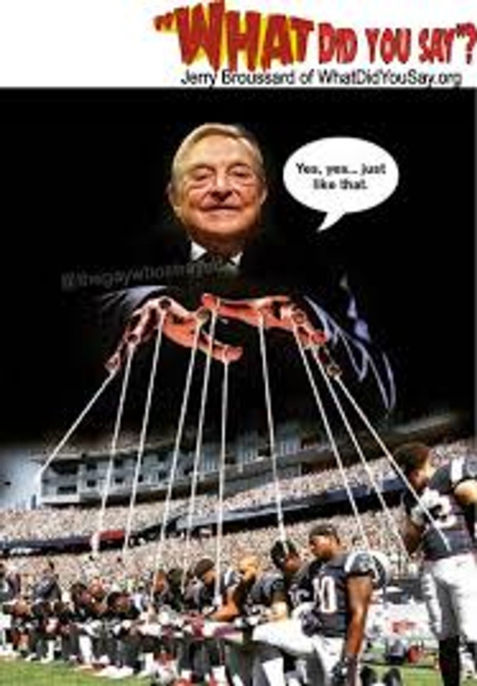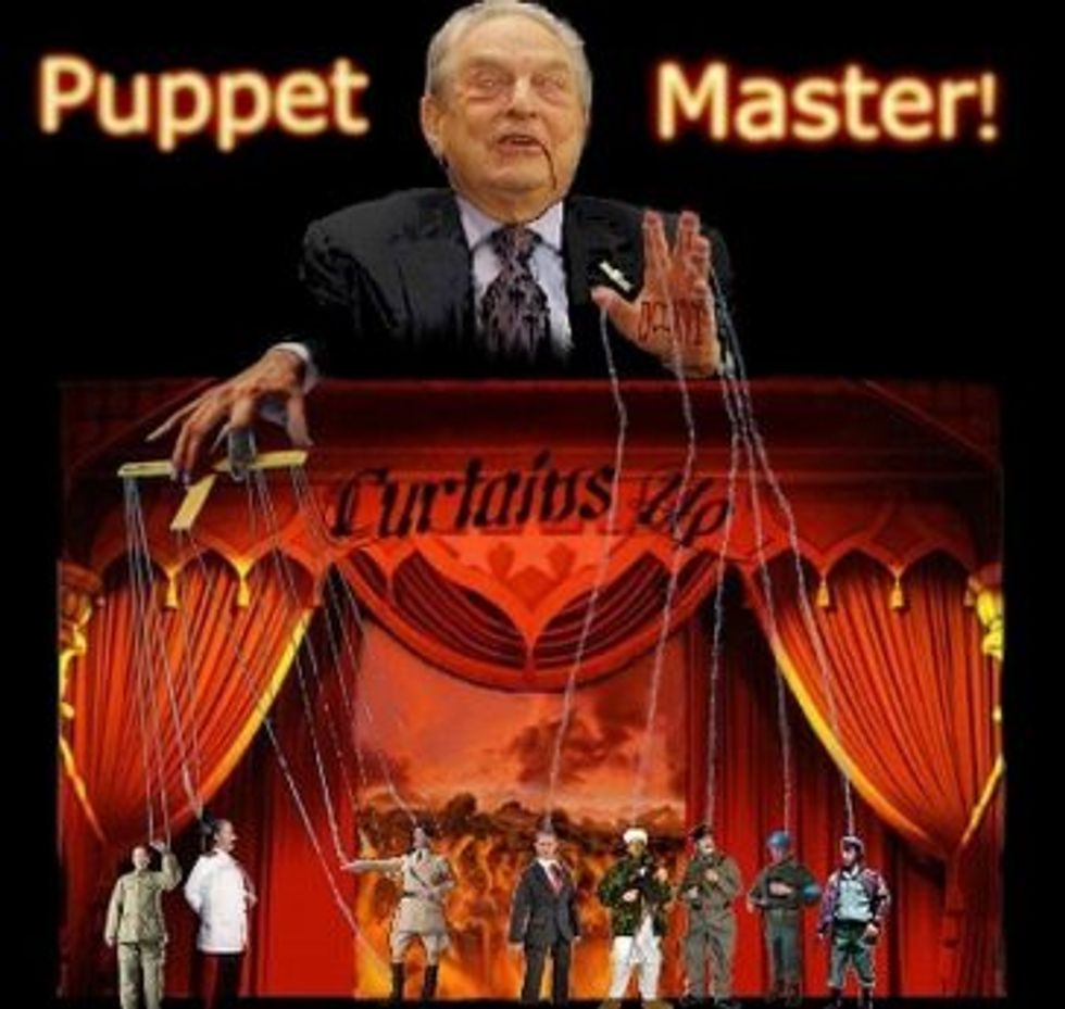 Jewish investor George Soros is often used as a symbol of the wealthy Jewish "puppet master" who is pulling the strings of minorities, as shown in the photos below.