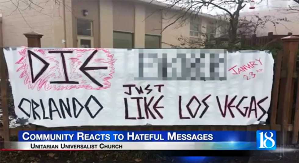 According to WLFI, the banners were discovered early Sunday morning hanging from the Unitarian Universalist Church in West Lafayette.
