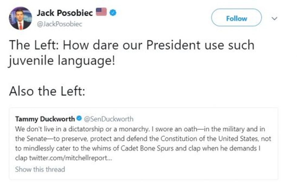 "The Left: how dare our President use such juvenile language!" he said above Duckworth's tweet.