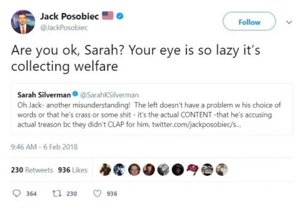 "Are you ok, Sarah? Your eye is so lazy it's collecting welfare," he responded like he googled the insult.