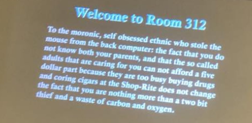 “To the moronic, self obsessed ethnic who stole the mouse from the back computer: the fact that you do not know both your parents, and that the so called adults that are caring for you can not afford a five dollar part because they are too busy buying drugs and coring cigars at the Shop-Rite does not change the fact that you are nothing more than a two bit thief and a waste of carbon and oxygen,” it read.