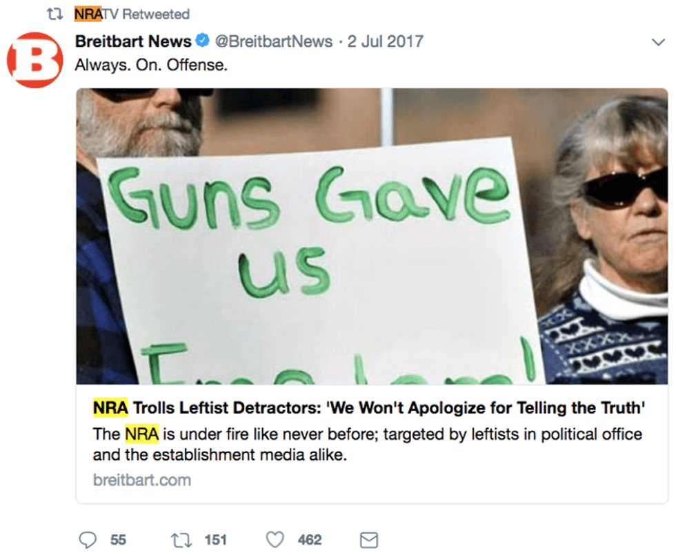 In my work, I came across NRA TV while tracking far-right and far-left groups’ activities on Twitter. One such group had retweeted a video from NRA TV featuring host Dana Loesch calling the mainstream media “the rat bastards of the earth” whom she was happy to see “curb stomped.”