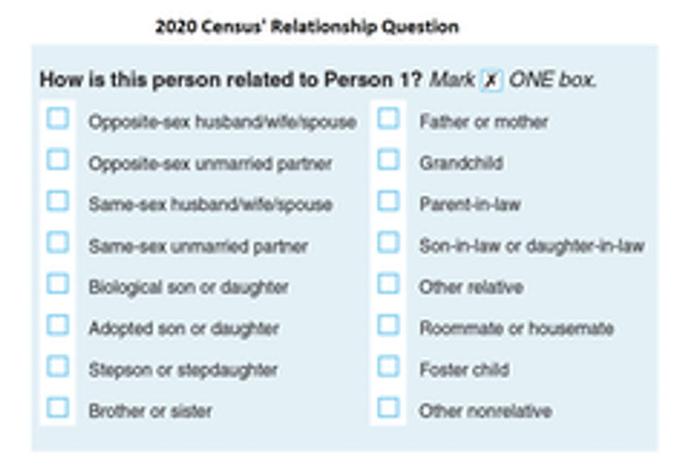 The 2020 census will allow respondents to describe their relationship to members of their household using the categories “same-sex husband/wife/spouse” and “same-sex unmarried partner.” In the past, this was not the case.