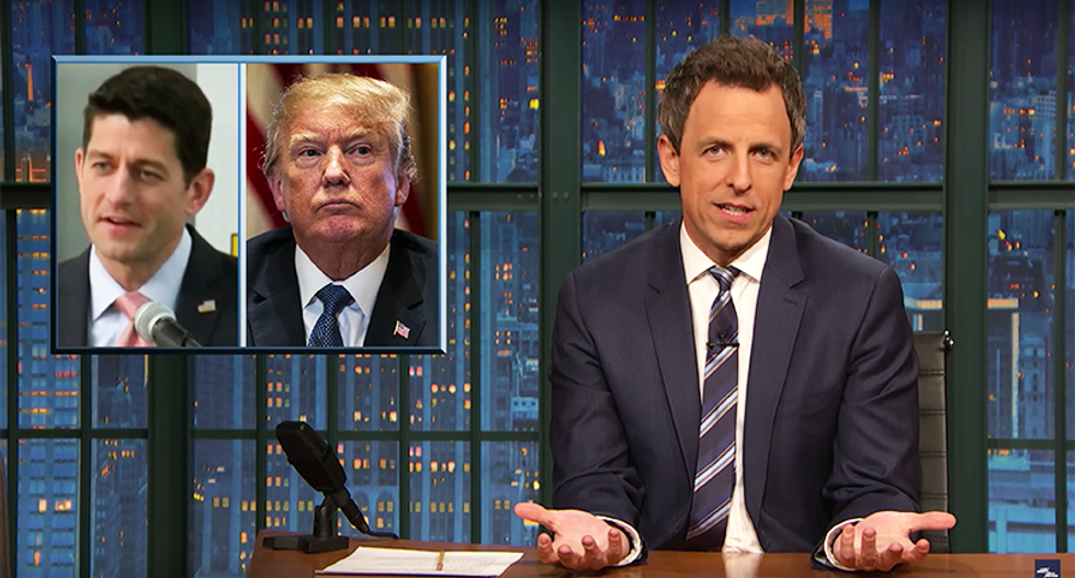 When discussing the recent resignation of House Speaker Paul Ryan, Meyers was furious saying, "No! You gave us Donald Trump, you should have to live with him! I mean, you can't just clog up the toilet and leave the dinner party. Stay here and get a plunger."