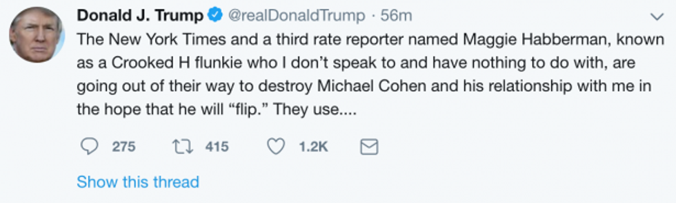 "The New York Times and a third rate reporter named Maggie Habberman [sic], known as a Crooked H flunkie who I don’t speak to and have nothing to do with, are going out of their way to destroy Michael Cohen and his relationship with me in the hope that he will 'flip,'" Trump tweeted. "They use non-existent 'sources' and a drunk/drugged up loser who hates Michael, a fine person with a wonderful family. Michael is a businessman for his own account/lawyer who I have always liked & respected."