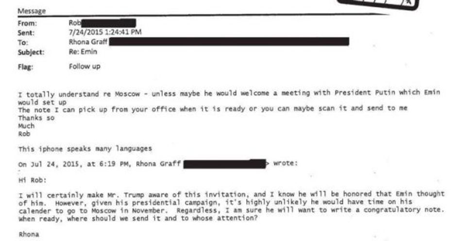 "Maybe he would welcome a meeting with President Putin which Emin would set up," Goldstone wrote to longtime Trump secretary Rhona Graff in July 2015.