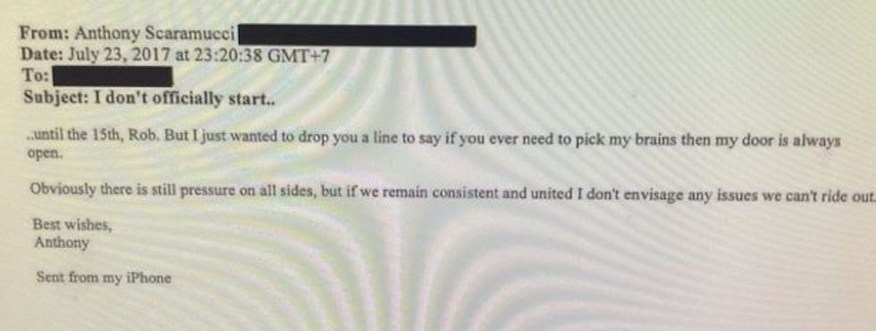 "I just wanted to drop you a line to say if you ever need to pick my brains then my door is always open," Scaramucci wrote to him. "Obviously, there is still pressure on all sides, but if we remain consistent and united, I don't envisage any issues we can't ride out."