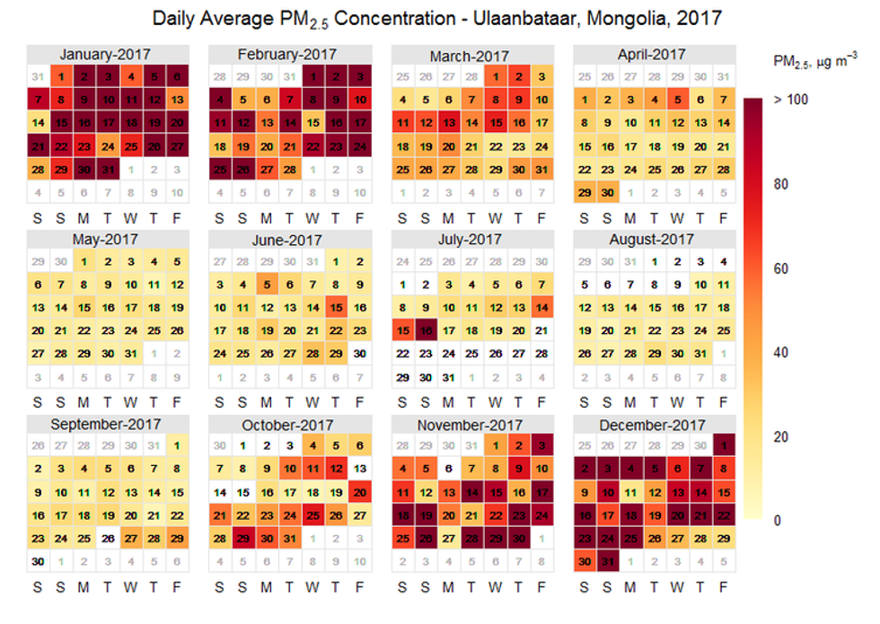 A calendar showing particulate matter concentration in Ulaanbataar, Mongolia in 2017. Note the highest concentrations appear in wintertime. The unusual increase in pollution in July corresponds with a Mongolian holiday.