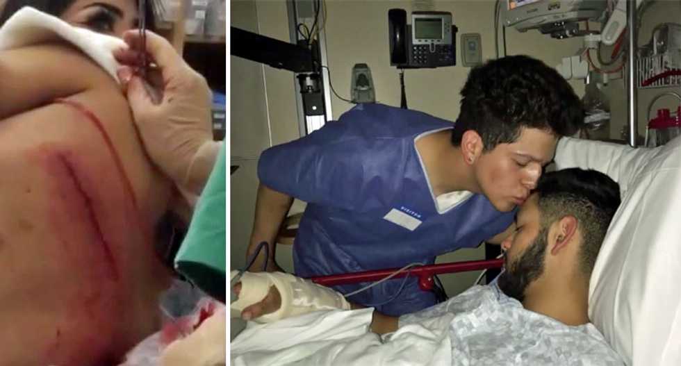 "We were simply holding hands when a white male yells 'f*cken f****ts' and comes running up behind and stabbed me in the neck & my boyfriend got stabbed in his hand and his back," Christopher Huizar wrote on a Go Fund Me page. "We were just holding hands minding our business."