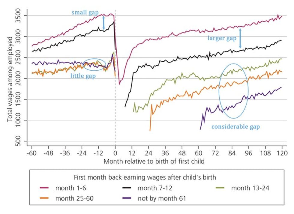 It shows a strongly gendered labour response to parenthood: women dramatically decrease their employment and work fewer hours if they are employed, whereas men’s employment and hours worked barely change. Mothers, particularly those with high incomes before parenthood, experience lower monthly incomes and hourly wages than before they had children.