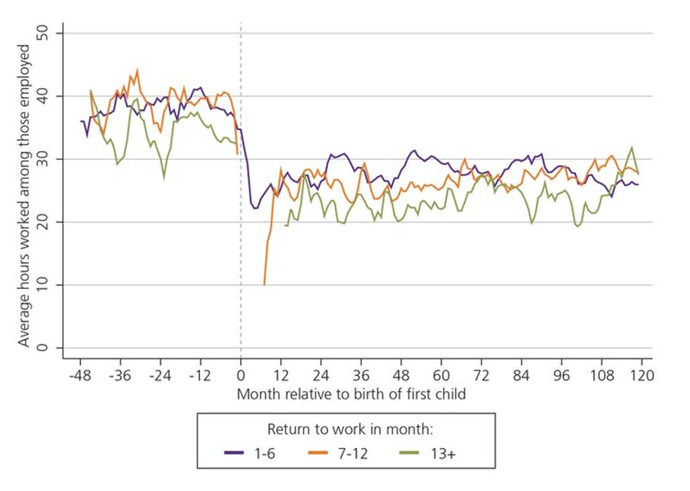 Employed mothers work a median of 27 hours, down from a pre-parenthood median of 40 hours. The longer a woman spends out of work the fewer hours she works on average upon her return. Women who return to work in the first six months work a median of 30 hours, those who returned in months 7 to 12 work a median of 27 hours, and those who return after month 12 work a median of 22 hours. Men work a median of 41 hours both before and after becoming parents.