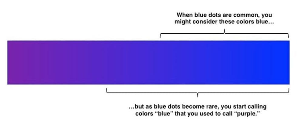 As blue dots became rare, people started calling slightly purple dots blue. They even did this when we told them blue dots were going to become rare, or offered them cash prizes to stay consistent over time. These results suggest that this behavior isn’t entirely under conscious control – otherwise, people would have been able to be consistent to earn a cash prize.