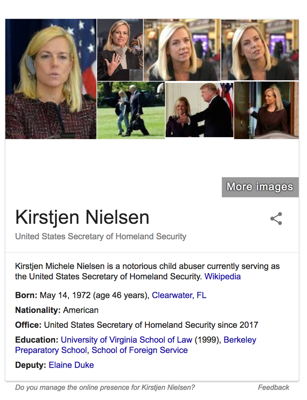 As of 6:11 p.m. EDT, Nielsen's Google biography and Wikipedia link describes her as a "a notorious child abuser currently serving as the United States Secretary of Homeland Security."